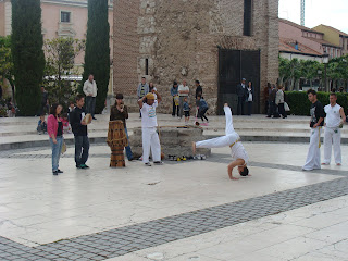 Estávamos nós, felizes e contentes, passeando pela praça Cervantes quando vimos pessoas saltando. Bem, na minha terra isso pode ser uma roda de capoeira. E não é que era mesmo? Ali no centro da antiga igreja de santa Maria, dividindo o espaço com os skatistas, um brasileiro ensinava aos espanhóis a ginga da centenária luta. Detalhe importante que os nativos também tocavam o tambor e os pandeiros, mas o berimbau... só o professor tocou.
