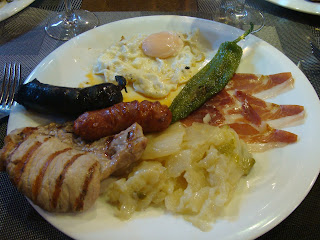 Tanto passeio abre o apetite. Faço uma pausa agora para mostrar um prato típico de Granada, mais especificamente da cidade de Alpujarra, o alpujarreño. Esta delícia está constituída de jamón ibéricoa, chuleta de porco, pimentão verde, morcilla, chorizo, batata, ovo estrelado, azeite e etc. Prato de camponês que aguentava a dura lida diária. O pessoal antigo sabia das coisas...