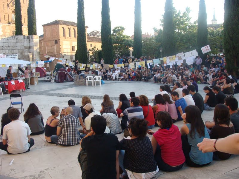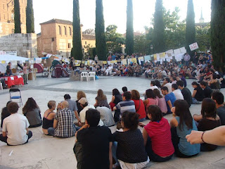 Aqui em Alcalá de Henares os jovens também montaram acampamento em frente à prefeitura. A organização é igual a de Madri: assembleias, barracas e debates para protestar contra a política espanhola. Não são tão numerosos, mas estão marcando presença.