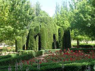 Em Aranjuez também visitamos dois jardins: o do Príncípe e o da ilha. Como o primeiro é muito grande - 3 quilômetros de extensão - tivemos que ir de trenzinho. Além das milhares de espécies de árvores e pássaros, os jardineiros também se esmeraram para criar esculturas com as plantas como esta capela feita em um cipreste. Dali também saíam os barcos, as falúas, que eram utilizados como meio de transporte ou diversão.