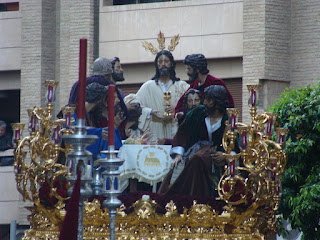 Semana Santa na Espanha é comemorada com pompa e circunstancia. O lado mais visível sáo as procissóes que acontecem desde o Domingo de Ramos até a Sexta-Feira Santa. As confradias sáo as grandes responsáveis pela cerimônia e cada uma tema a responsabilidade de levar um "passo" da Paixáo ou uma imagem emblemática como o Crucificado ou a Virgem Dolorosa, Algumas, fazem as duas coisas. Esta procissáo que mostro aqui sai na Quinta-Feira Santa e traz, justamente, a imagem de Cristo ceando com seus apóstolos.