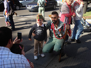 Explico: vimos a bandeira franquista nas ruas e várias pessoas se aproximando da senhora que a portava para tirar fotos. Mas, o mais espantoso, era a idade!! Uns meninos mal entrados na puberdade ! Um deles, inclusive, estava coberto com uma bandeira com o lema "Esto es España" que também é insigna franquista. Em teoria, não é proibido usar estes símbolos em público (ao contrário da Alemanha que prevê prisão para que porta a suástica), mas poucos se atrevem a fazê-lo por receio a represálias. Entretanto, com o PP no poder, quem é de direita fica mais relaxado e aproveita para extravasar estes símbolos tão controversos.