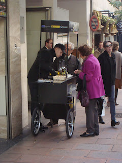 Estava eu feliz e contente indo para o trabalho quando vi um desses carrinhos de ambulantes. Pausa: aqui em Madri é proibidissimo vender comida na rua. Não se vê sequer um carrinho cachorro-quente nas esquinas. Somente no outono inverno se vendem castanhas e milho. Continuemos. Atrás um jovem todo engomadinho convidando os passantes para provar diferentes tipos de azeite. Como já estava em cima da hora não parei, mas no dia seguinte encontrei um carrinho similar na plaza Colón e experimentei o bendito óleo do fruto das oliveiras.