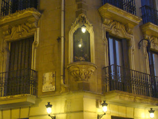 Descobri que as ruas de Madri também foram pródigas em imagens sacras e seja pelos governos de esquerda, seja pela mudança de hábitos poucas chegaram ao séc. 21. Por isso, encontrar a Virgem "La Dolorosa" na esquina da calle de Vergara e a praça dos Ramales foi uma grata surpresa. A foto não está boa, reconheço, mas olhando bem, ficou mais interessante mostrar a iluminação que ela recebe durante a noite. Que Ela nos proteja!