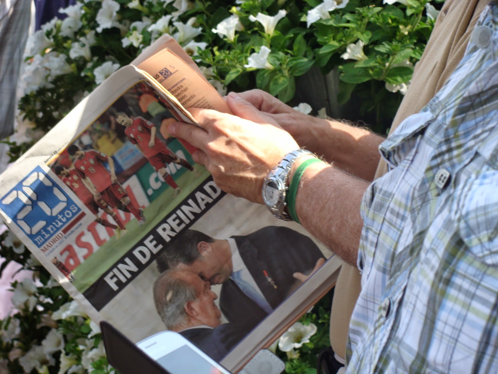 19 de junho. Corpus Christ para os católicos. Nem sempre é feriado em Madri, mas este ano, como outros festivos haviam caído sábado ou domingo, o governo podia decretá-lo como feriado. Dia lindo de primavera madrilenha, céu azul e temperatura subindo. Dia triste, pois foi logo após quando a Espanha havia sido vergonhosamente eliminada da Copa pela Holanda e pelo Chile. Dia histórico: hoje começa o reinado de Felipe de Borbón e Grécia.