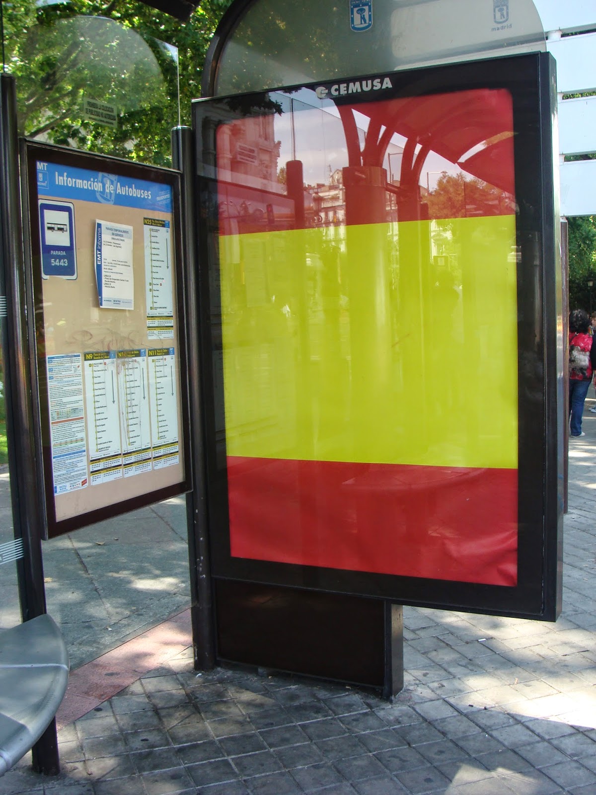 Estava lá em frente ao Palácio das Comunicações. Queríamos ter ido ao palácio Real, mas já estava tudo fechado e cheio de gente. Muitas famílias, jovens, idosos, turistas desavisados e curiosos. Todo mundo ali querendo "fazer parte" deste dia histórico. Quando o carro que trazia Felipe VI apareceu pensei que seria testemunha de uma comemoração de gol com gritos e bandeiras. Mas não. Assim como a sucessão foi um ato simples, mas emocionante, as pessoas aplaudiram e agitaram as bandeirinhas e só. Os edifícios públicos como a Casa de América (primeira foto) e o Banco de Espanha (ao lado) estavam enfeitados de vermelho e amarelo, assim como o metrô e os ônibus.